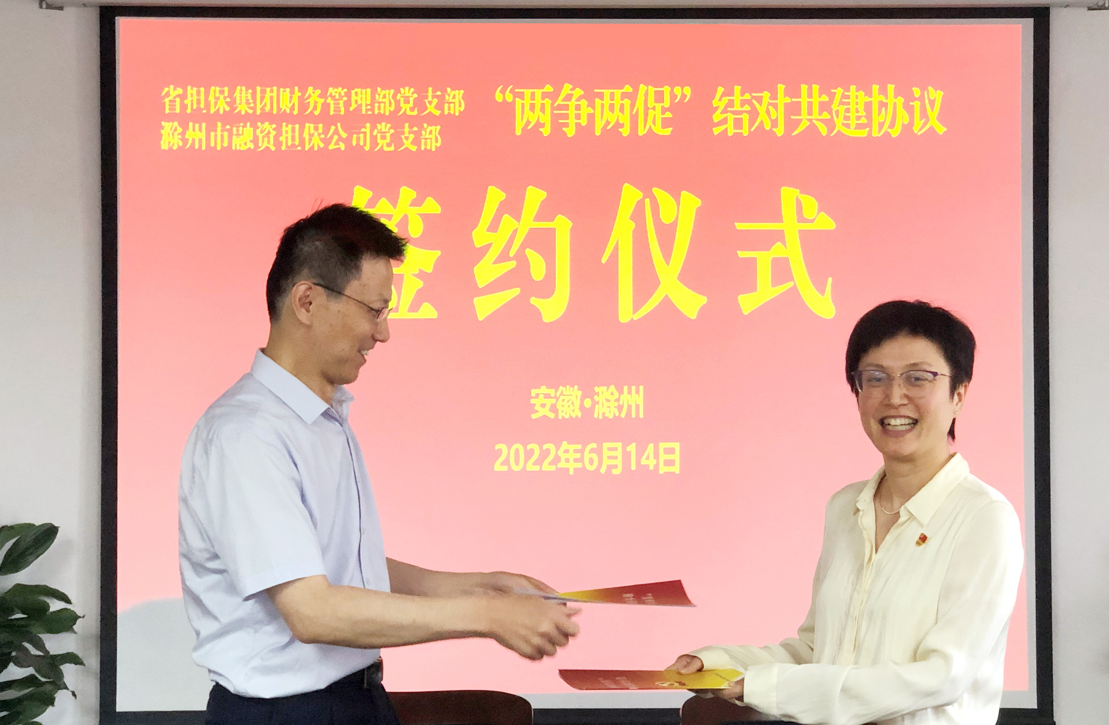 活動中,雙方簽署了“兩爭兩促”結(jié)對共建協(xié)議,開展了“傳承紅色基因 凝聚紅色力量”主題黨日活動,省擔(dān)保集團(tuán)還向我單位贈送了黨建書籍。